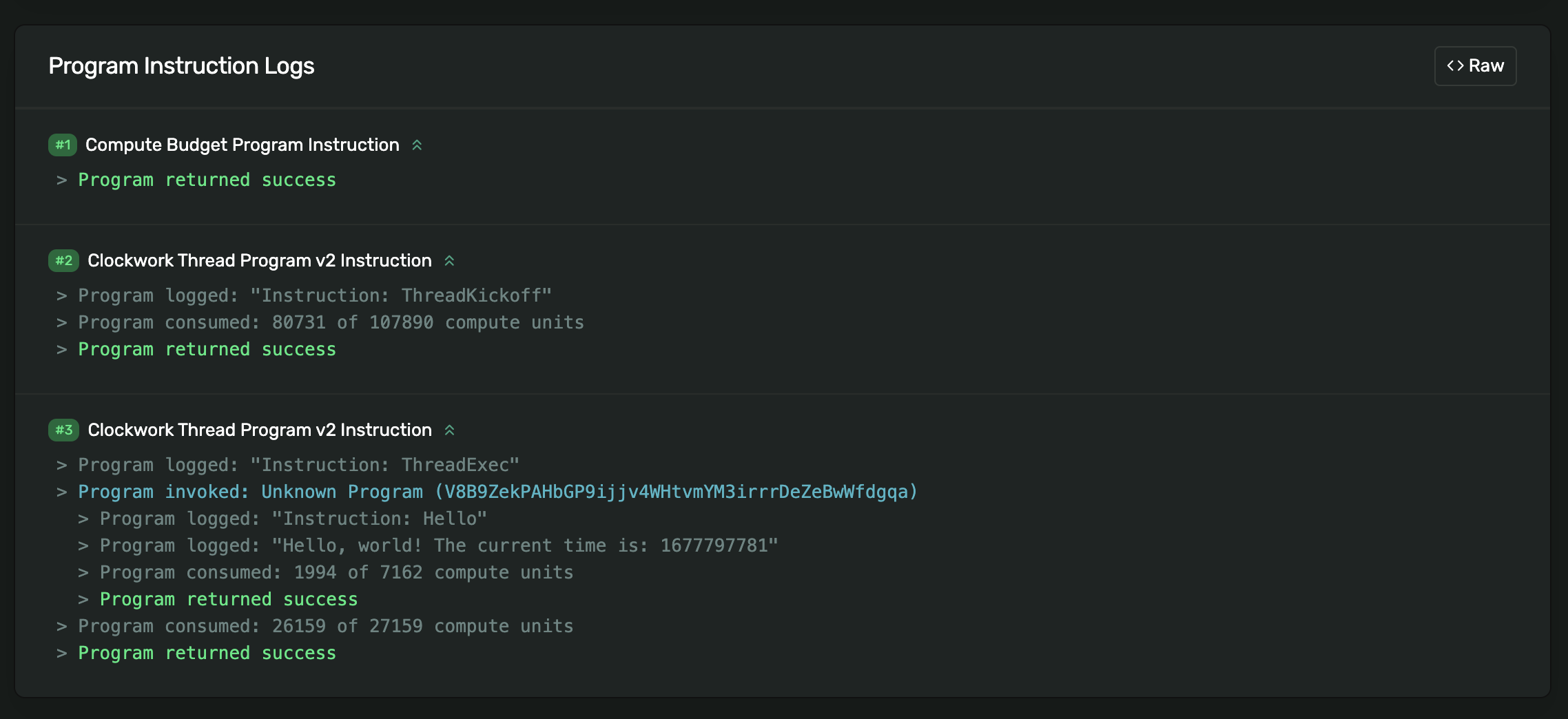 If you setup everything correctly, you can now watch your automated program run all on its own. Grab the Clockwork explorer link that was printed out to the console. Using the Clockwork explorer, you can get simulation logs and inspect if your thread is not running and why. For example, here's mine: https://app.clockwork.xyz/threads/GB7YgYK3bKF8J4Rr9Z2oeA3hwxrJdvW5zgXuNaxWWmUF?cluster=devnet