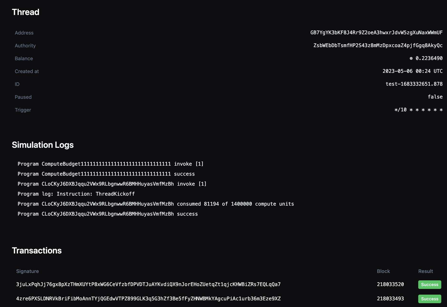 You can now watch your automation run all on its own. Grab the Clockwork explorer link that was printed out to the console. Using the Clockwork explorer, you can get simulation logs and inspect your thread. For example, here's mine: <https://app.clockwork.xyz/threads/GB7YgYK3bKF8J4Rr9Z2oeA3hwxrJdvW5zgXuNaxWWmUF?cluster=devnet>